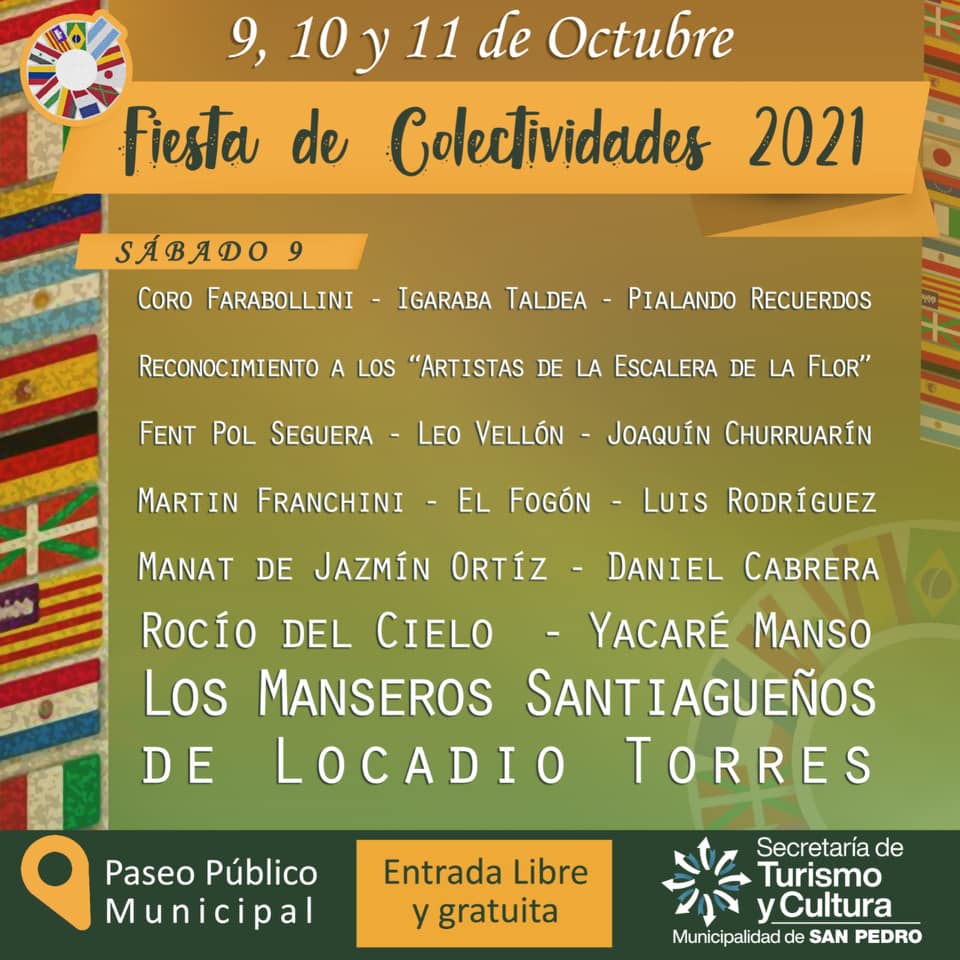La Fiesta de las Colectividades 2021 se desarrollará el fin de semana largo del 9 al 11 de octubre en el Paseo Público municipal, con entrada libre y gratuita.